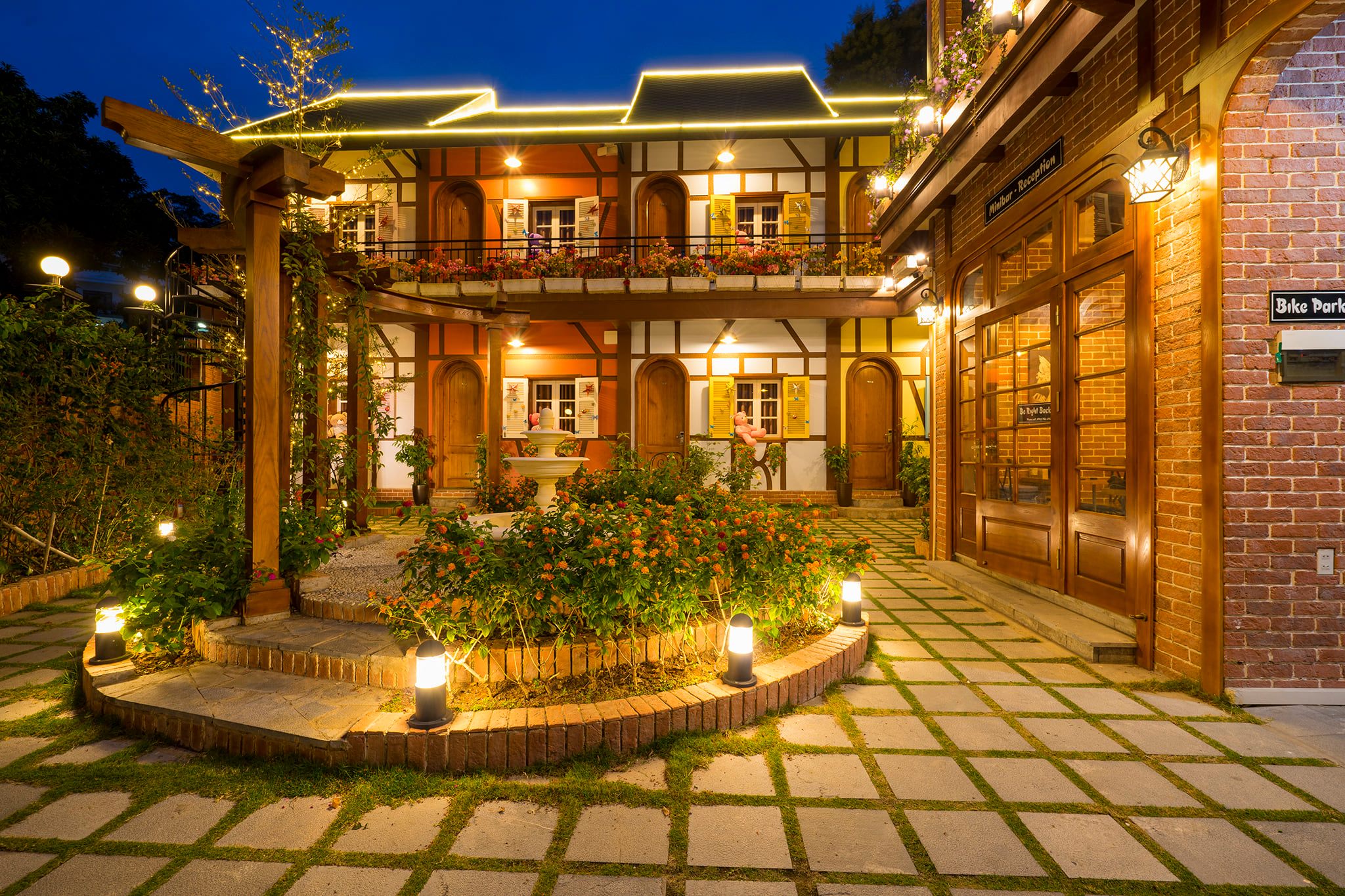 Đi từ ngoài vào, chúng ta đã thấy Little Colmar Boutique hiện lên với một vẻ đẹp rất nên thơ, trữ tình. Ngay ngoài trời là khoảng sân vườn nhỏ có chứa đài phun nước, đường đi được lát thêm gạch và đá nên rất sạch sẽ. Ở góc bên đối diện khu phòng nghỉ là một chiếc xích đu nhỏ và có rất nhiều loài hoa được trồng xung quanh.